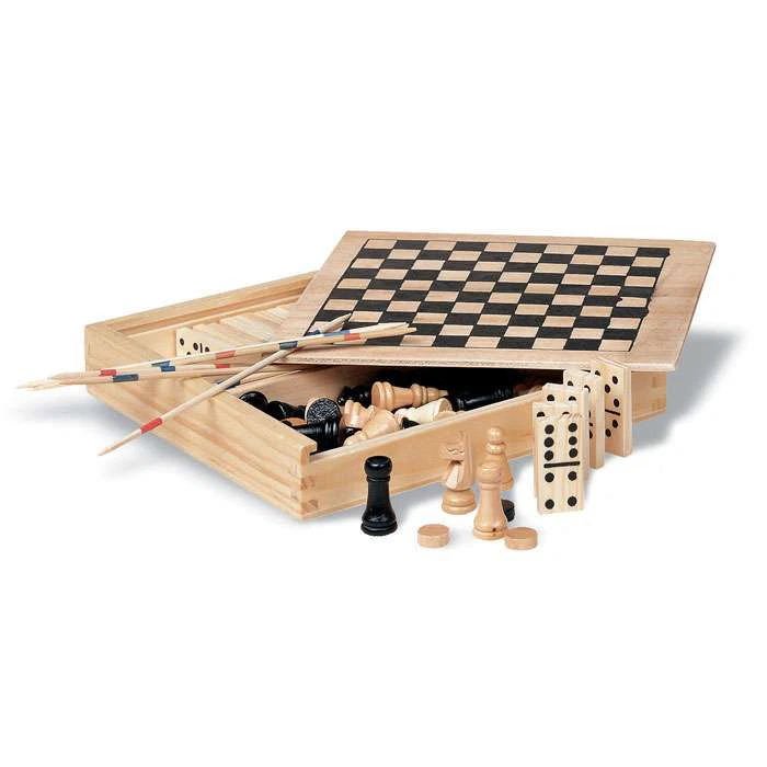 Detta är ett 4 i 1 spel som består av domino, plockepinn, schack och drafts.