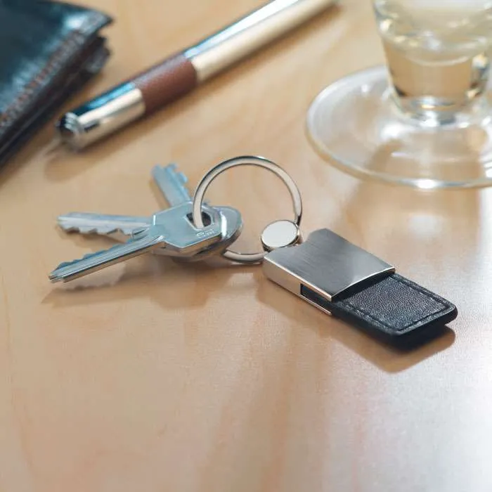 Detta är en rektangulär nyckelring i metall med ett band i fakeläder