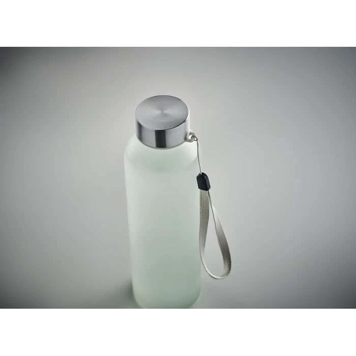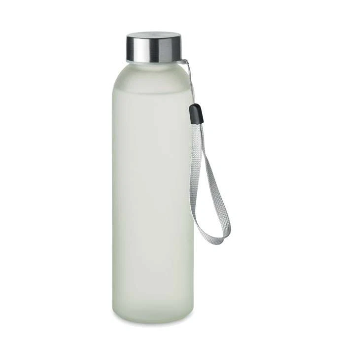 Glasflaska med specialbeläggning för sublimering. Flaskan har en skruvkork i plast med en handögla på. Flaskan rymmer 500ml